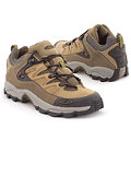 Low-cut footwear designed for hiking in moderate to rugged terrain, featuring split suede leather upper material with synthetic lining and Mountain Contragrip with Advanced Chassis sole constrution.