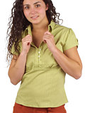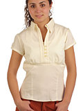 A shirt that Marilyn Monroe might have worn, the Ruby has a deep v-neck with button and loop closure that keeps it modest.