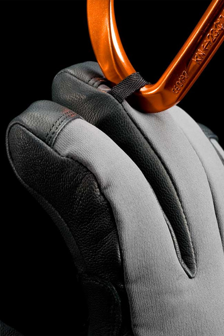 - Finger-mounted clip-in loop enables gloves to be attached to a carabiner with finger-tips facing up, eliminating snow-fill