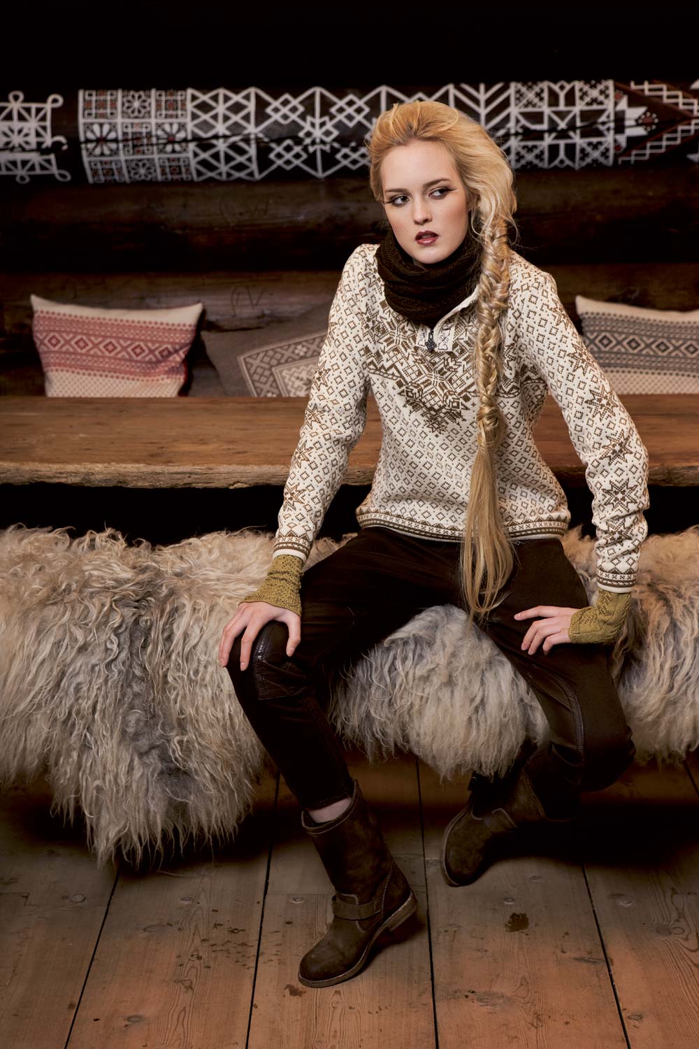 For the more dressy Norwegian sweater head towards Dale's Bogstad. It's fully covered in stitched print and has a beautifully designed snowflake depiction embroidered across the top of the sweater. Dale of Norway's attention to detail stands out on this sweater, the zippered neck has a stitched floral pattern along the sides of the zip. The zipper itself makes use of a metal decorative pull-tab that matches perfectly with the sweater's motif.