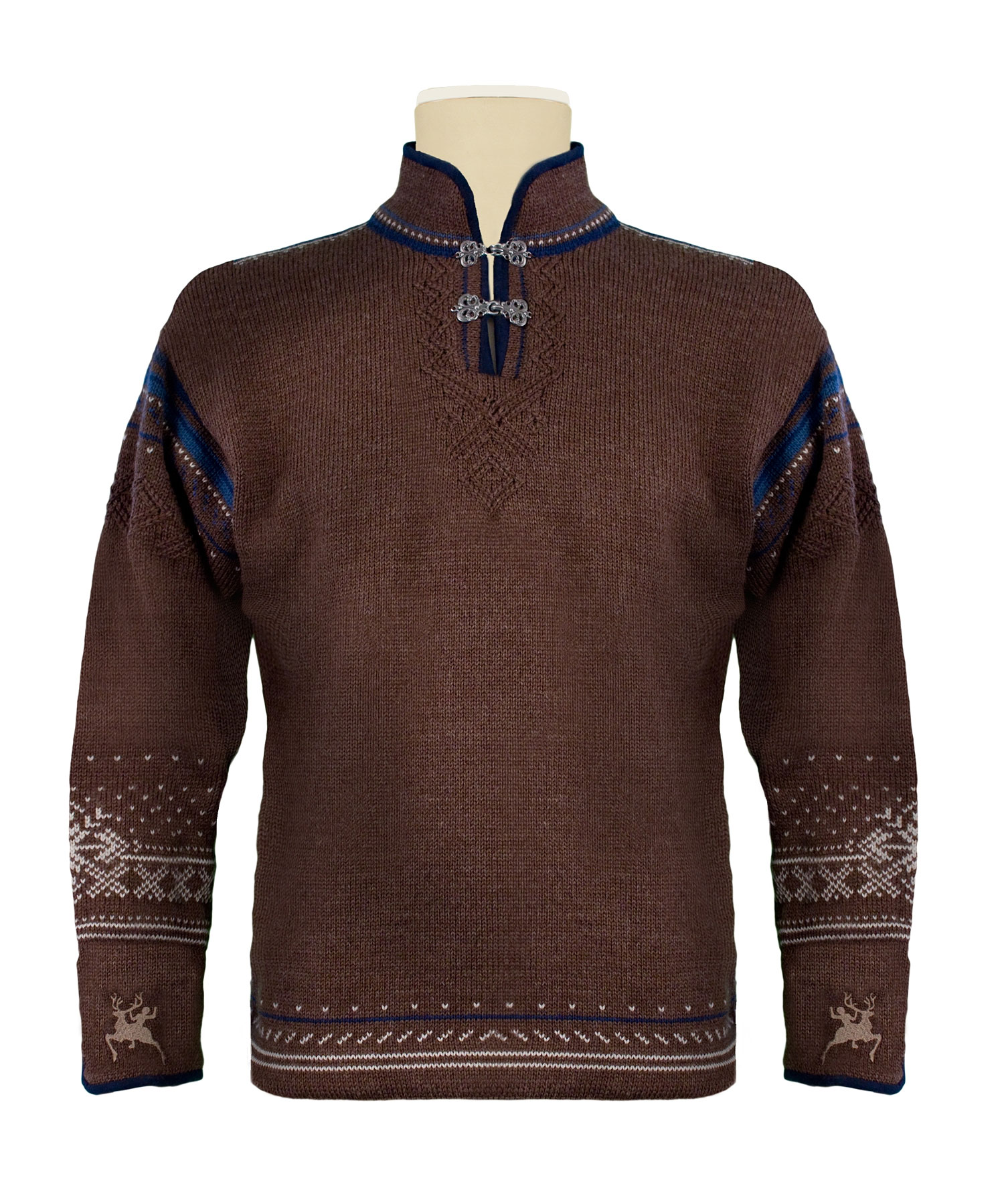 Henrik Ibsen is often referred to as the "father of modern drama" and celebrated as a national symbol by Norwegians. Among his best-known dramas is the beloved Peer Gynt, written in 1867 during Ibsen`s travel in Italy. Peer Gynt includes incidental music by another Norwegian treasure, composer Edvard Grieg. Our exclusive "Ibsen" sweater incorporates sophisticated design elements inspired by its namesake`s masterwork. A finely detailed pattern on the sleeves illustrates the famous "buck ride" scene, in which the main character recalls a reindeer hunt that went awry.