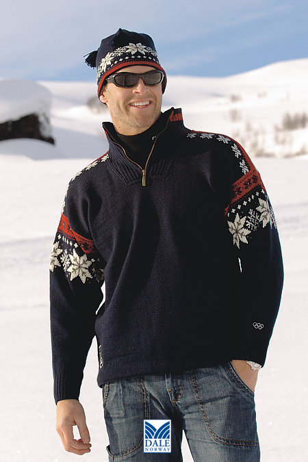 This is another edition of the line of historic sweaters celebrating past Olympic Winter Games. This model is paying tribute to the spectacular XIII Olympic Winter Games, and the design based upon the original Dale pattern from 1980. The 1980 Winter Games were filled with impressive performances. The Lake Placid 25th Anniversary sweater is a classic ski sweater with a high comfortable neck. The sweater has a patch with the official logo of the 1980 Olympic Winter Games on the lower body.