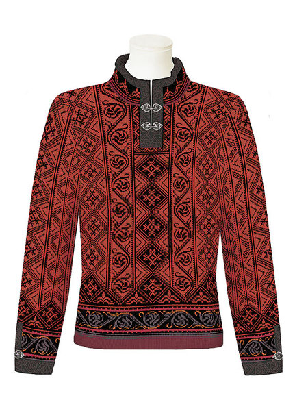This magnificent sweater is named after the charming mountain village called Voss in the Western part of Norway. Voss is located between Norways two most famous fjords: the Hardangerfjorden and Sognefjorden. In wintertime, Voss is a paradise for wintersports enthusiasts with its steep mountains and the variety of slopes for both cross country and alpine skiing. Many of Norways best wintersports athletes come from Voss. The local variant of Norways national Costume, the Voss bunad, is very popular and is by many ranked as the most beautiful in Norway. It is common that brides wear a special bridal version of the bunad and this is the inspiration behind our sweater Voss. Elements from the beaded pattern on the chestcloth and the bridal crone are incorporated in the design, as well as patterns from the shirt and apron embroidered in the special Hardanger technique. The heart is a popular symbol for the bridal costume and is often used both in the beaded pattern, the silver jewelry and the belt buckle. Thus it is natural that we use it in our special made clasps in the neck and on the cuffs.