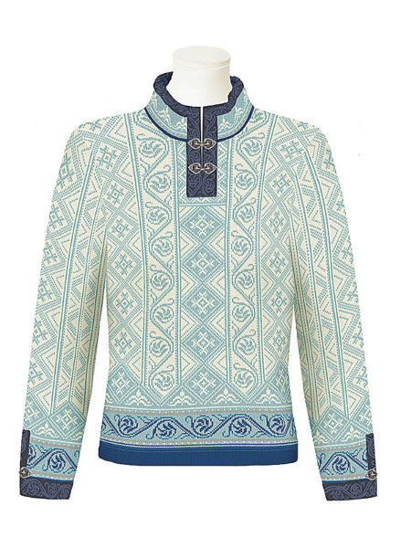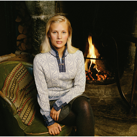 This magnificent sweater is named after the charming mountain village called Voss in the Western part of Norway. Voss is located between Norways two most famous fjords: the Hardangerfjorden and Sognefjorden. In wintertime, Voss is a paradise for wintersports enthusiasts with its steep mountains and the variety of slopes for both cross country and alpine skiing. Many of Norways best wintersports athletes come from Voss. The local variant of Norways national Costume, the Voss bunad, is very popular and is by many ranked as the most beautiful in Norway. It is common that brides wear a special bridal version of the bunad and this is the inspiration behind our sweater Voss. Elements from the beaded pattern on the chestcloth and the bridal crone are incorporated in the design, as well as patterns from the shirt and apron embroidered in the special Hardanger technique. The heart is a popular symbol for the bridal costume and is often used both in the beaded pattern, the silver jewelry and the belt buckle. Thus it is natural that we use it in our special made clasps in the neck and on the cuffs.