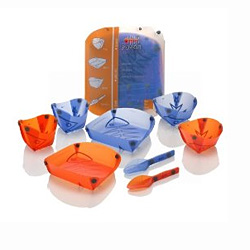 Tea for two! A complete 2 person set (2 Cups, Bowls, Dishes, and Spoons) in a unique notebook style self storage container. Color coded so you know who belongs to what. An environmentally friendly alternative to disposables.