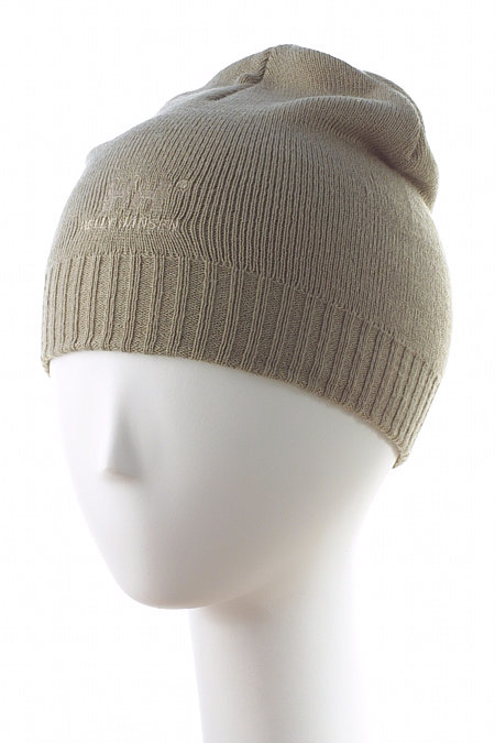 Acrylic Helly Hansen logo beenie with rounded top knit consturction, rib cuff and emroided logo.