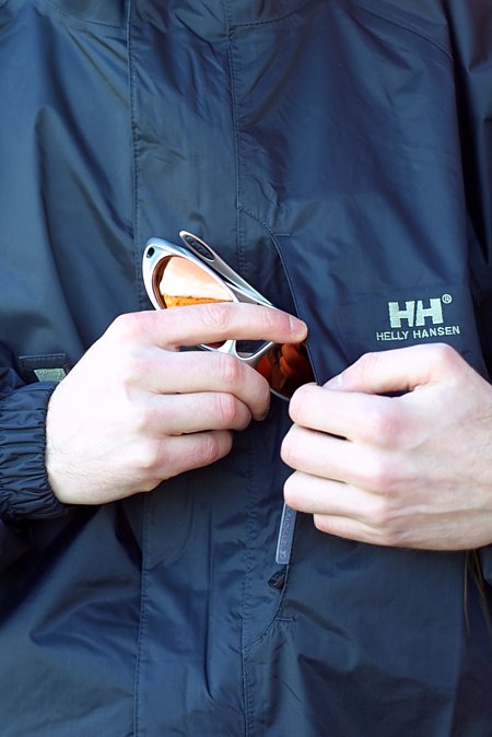- Mid length waterproof/breathable shell jacket with packable pocket on chest