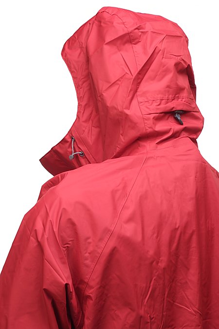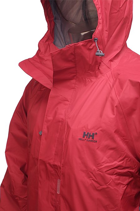 - Mid length waterproof/breathable shell jacket with packable pocket on chest