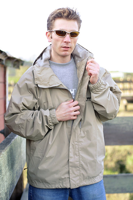 - Mid length waterproof/breathable shell jacket with packable pocket on chest