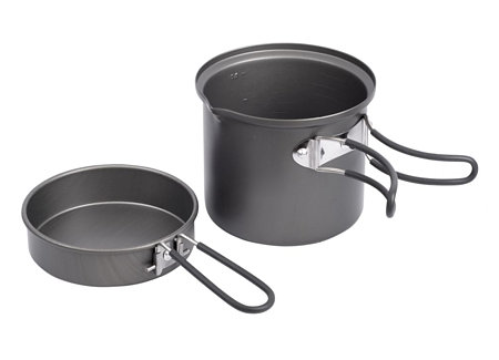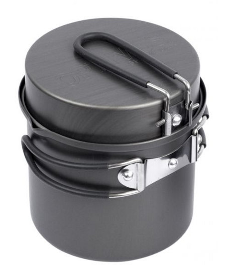 Optimus Terra Weekend Cookset ultra light 0.95L hard anodized aluminum cookset with frypan and mesh bag. Check out the spout and measuring marks on the pot to always get the perfect measurement. 220g gas canister, Crux/Crux Lite and folding spork all fit inside.