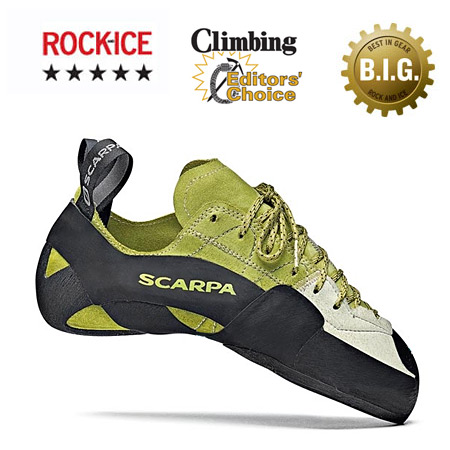 Flash boulder problems you thought were impossible with Scarpa's highly aggressive Mago climbing shoe. The Mago keeps your foot in a tenacious position, aiding you in sticking to the tiniest of chips and ledges. A rubber covered toe grips strongly while toe hooking and prevents you from blowing out of the toe of your shoe. If you're looking for a highly aggressive shoe for insane sports or mighty bouldering the Mago is a bomber shoe.