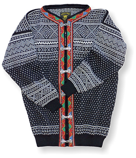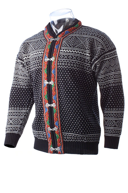 - Norwegian cardigan sweater with embroided collar and metal clasps