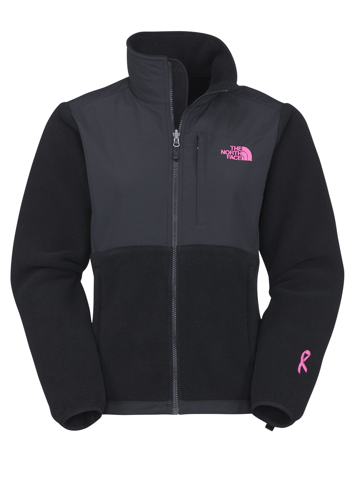 The North Face has teamed up with Boarding For Breast Cancer, a non-profit, education awareness foundation for to create this season's iconic Denali Jacket and will make an annual donation to help support their journey to educate and inspire young adults. Coveted fleece constructed with recycled Polartec 300 (midweight) fleece with DWR (durable water resistant) finish for added weather-resistance. Added abrasion-resistant nylon taffeta panels at chest, shoulders, and elbows for extra durability. Pink ribbon embroidered at left sleeve. Pink embroidered logos at left chest and right shoulder.