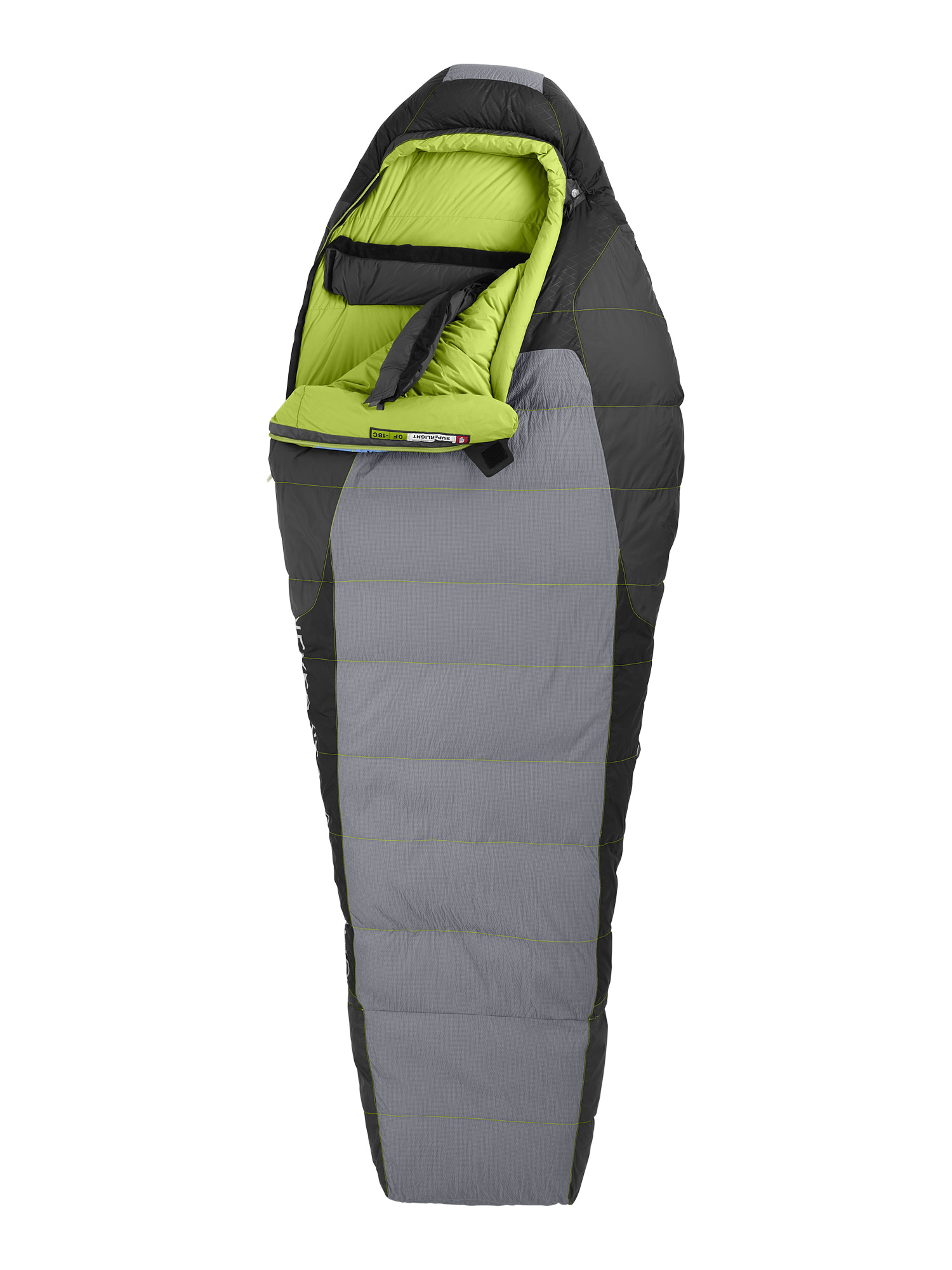 Expredition Down bags utilize a special trapezoidal baffle system in which adjacent trapezoid-shaped baffles are positioned with their parallel sides opposite one another. This configuration ensures a constant baffle volume, which holds the down in place and prevents cold spots.